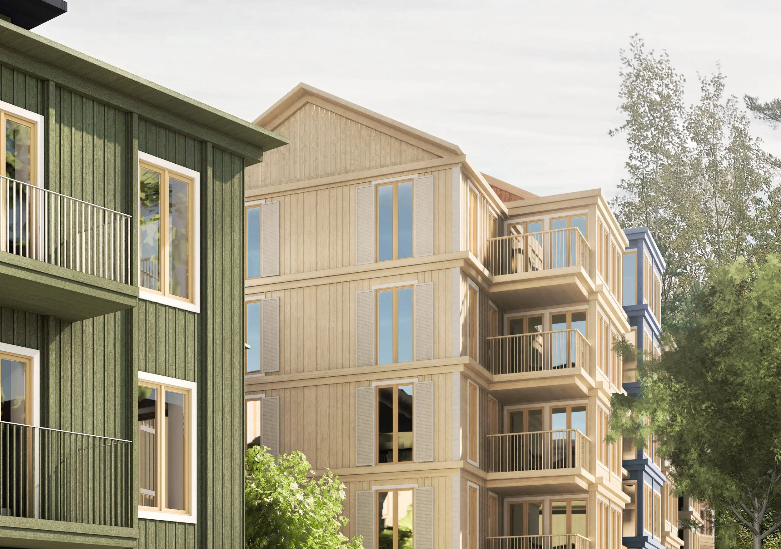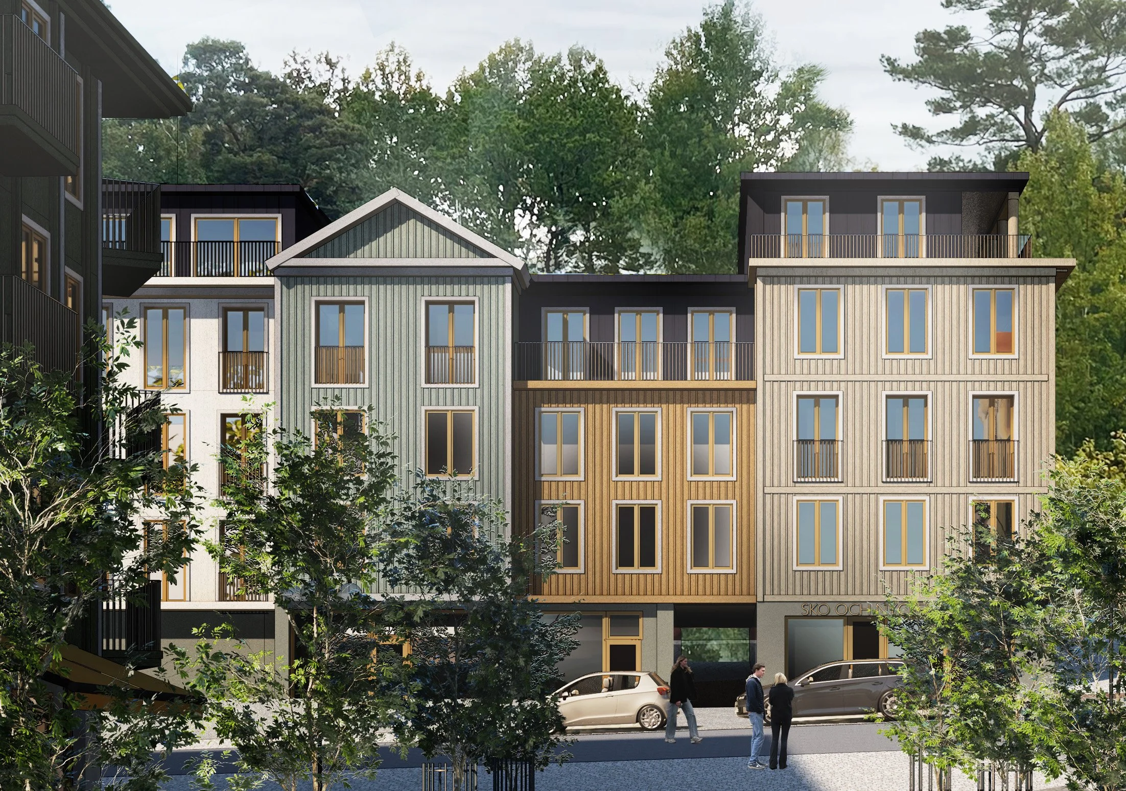 Målade träfasader i traditionell lockläktpanel ramar in nya gaturum, hus med varierade fasader och höjder betonar småskalighet och skänker liv till gatan
